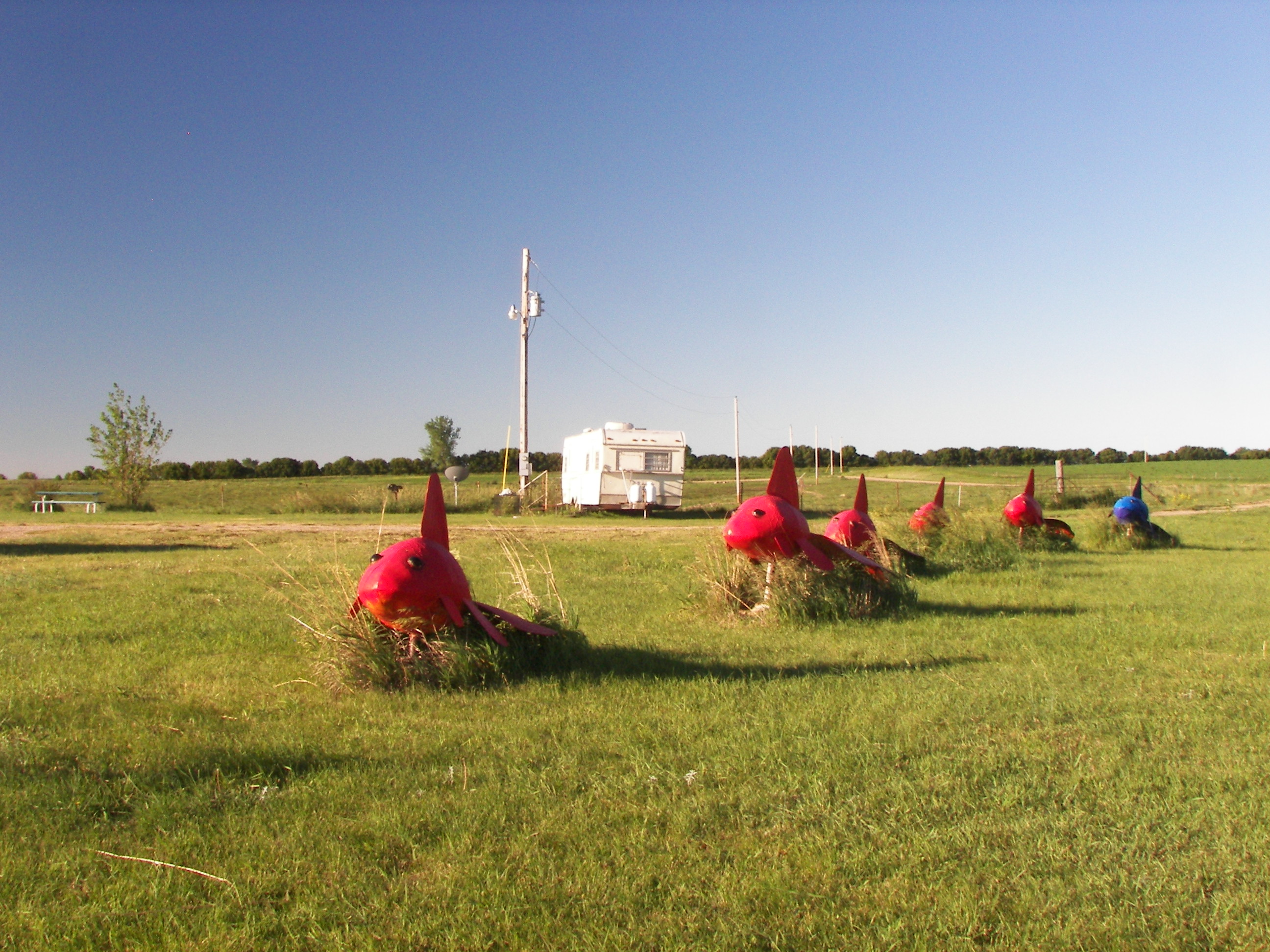 Red Fish, Blue FishIn winter Mr. Porter works in town, building more exhibits. He and his greeter dog spend summers on site, collecting admission. I'm a little squeamish about taking pictures of art because of the recursion that that introduces to the artist's symbology, but here I couldn't help myself ... and, anyway, even when you pause by the road to capture a panorama — even then — you are interpreting not only God's handiwork but also the craft of the road builder and assorted maintenance crew members, particularly the arborist. This is even true and even most especially true in the western parks ... so I let the chips fall where they may. Be aware then, O Reader, that my titles for Mr. Porter's works are my own. |