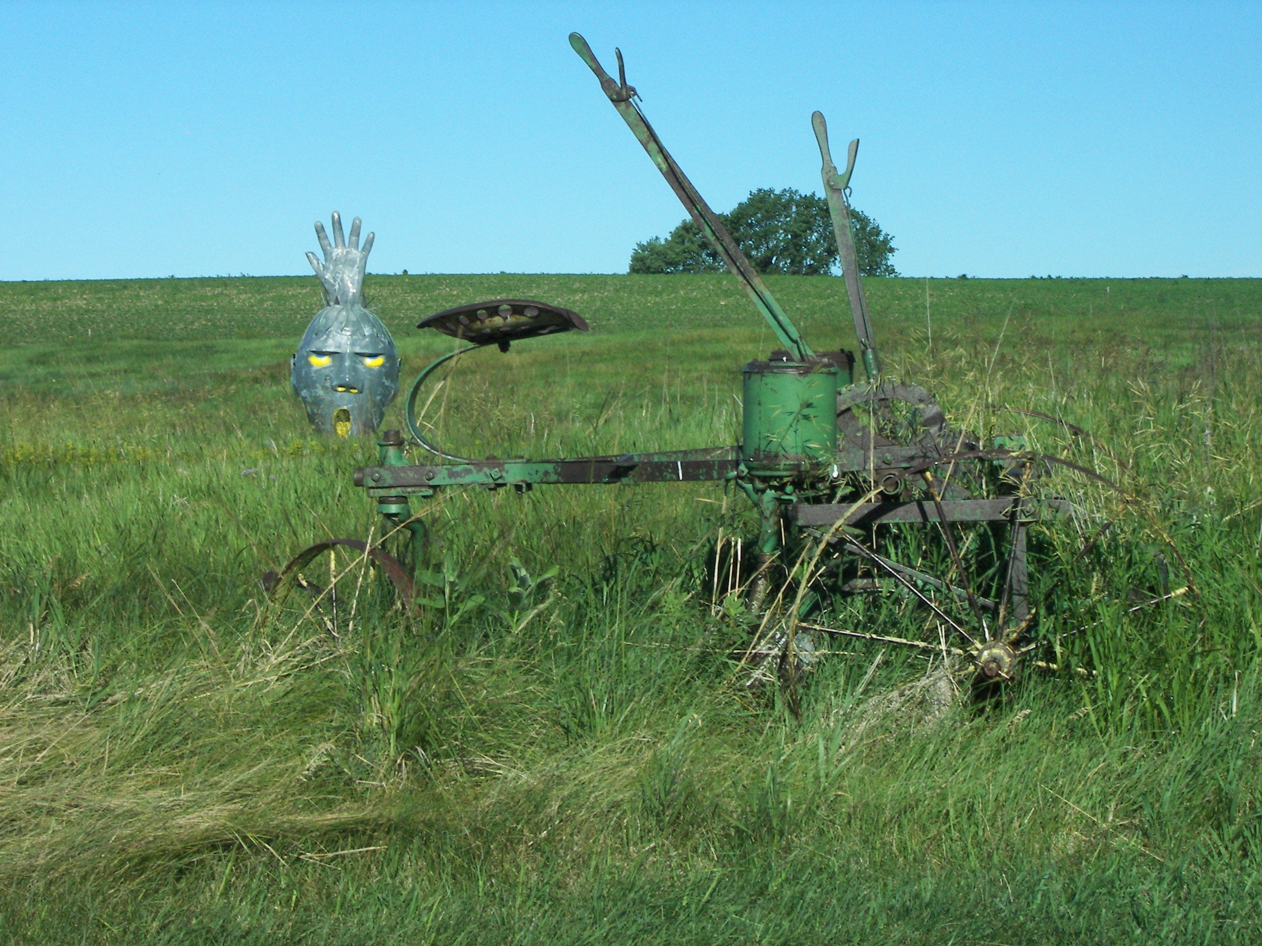Porter Sculpture ParkFirst up is Porter Sculpture Park, occupying an interchange 25 miles out of Sioux Falls, where in summer the artist, Wayne Porter, basks in the wind, the sun, and the attention of tourists on their way west to the Missouri River, the Badlands, and beyond. Mr. Porter's fireproof creations are fabricated from scrap metal and mounted on concrete. Most are painted. The installations appear haphazard. Do not be fooled: (Sightseers don't notice nor care, but photographers do.) Everything is tastefully arranged. In this frame, shot from the first step on the tour path, the one and only bush blots out the view of the neighboring farmstead.