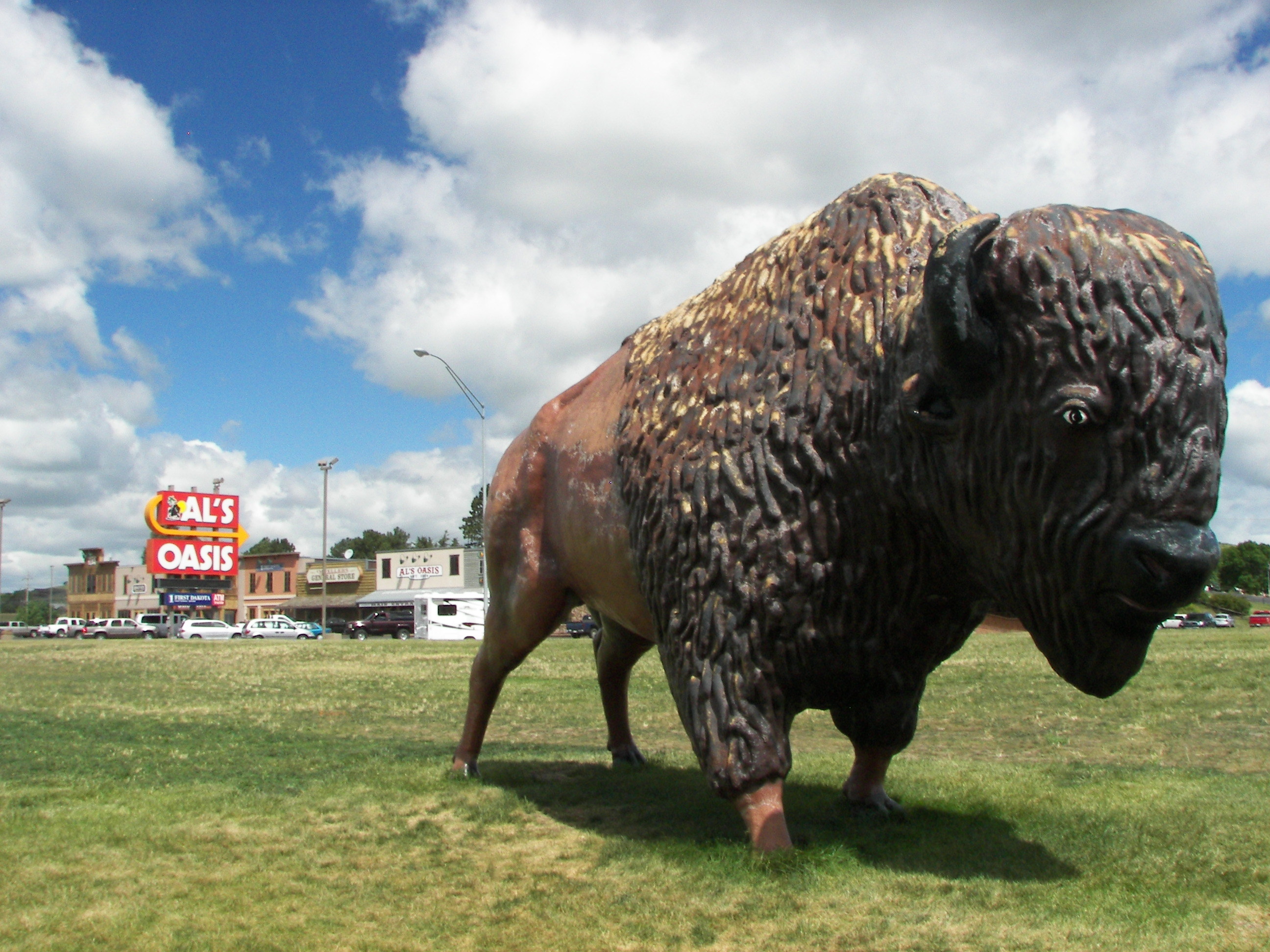 Al's OasisThen it's on to Al's Oasis, a truck stop on the Missouri River, which has matured into a tourist mecca, though in that regard it is the merest foreshadowing of the glories of Wall Drug. I didn't see any acolytes here. Oacoma, SD, is less than a degree east of 100° west, which divides the arable from the arid lands. In this place it is the river that signals the westward shift from flat terrain to high rolling hills, from row crops to hay. On this trip I missed recording a fuel stop partway through, so I don't have comprehensive mileage figures. Total distance was about 2300 miles. Over the first 1700 miles mileage by the tankful varied between 27 miles per gallon and 47 mpg. Variance is largely due to my practice of topping off each tank by varying amounts. Overall mileage was 35.9 mpg. However, I did encounter headwinds of 30 miles per hour for the better part of a couple of days. My 30-year-old bike kept ahead of traffic under 75 mph limits, sustaining relative air speeds in excess of 100 mph. Fuel prices varied from $3.579 at Luvern, MN, to $4.059 in the Dells of Wisconsin. Much of the price difference is due to my purchase of gasoline in preference to gasohol where available. |