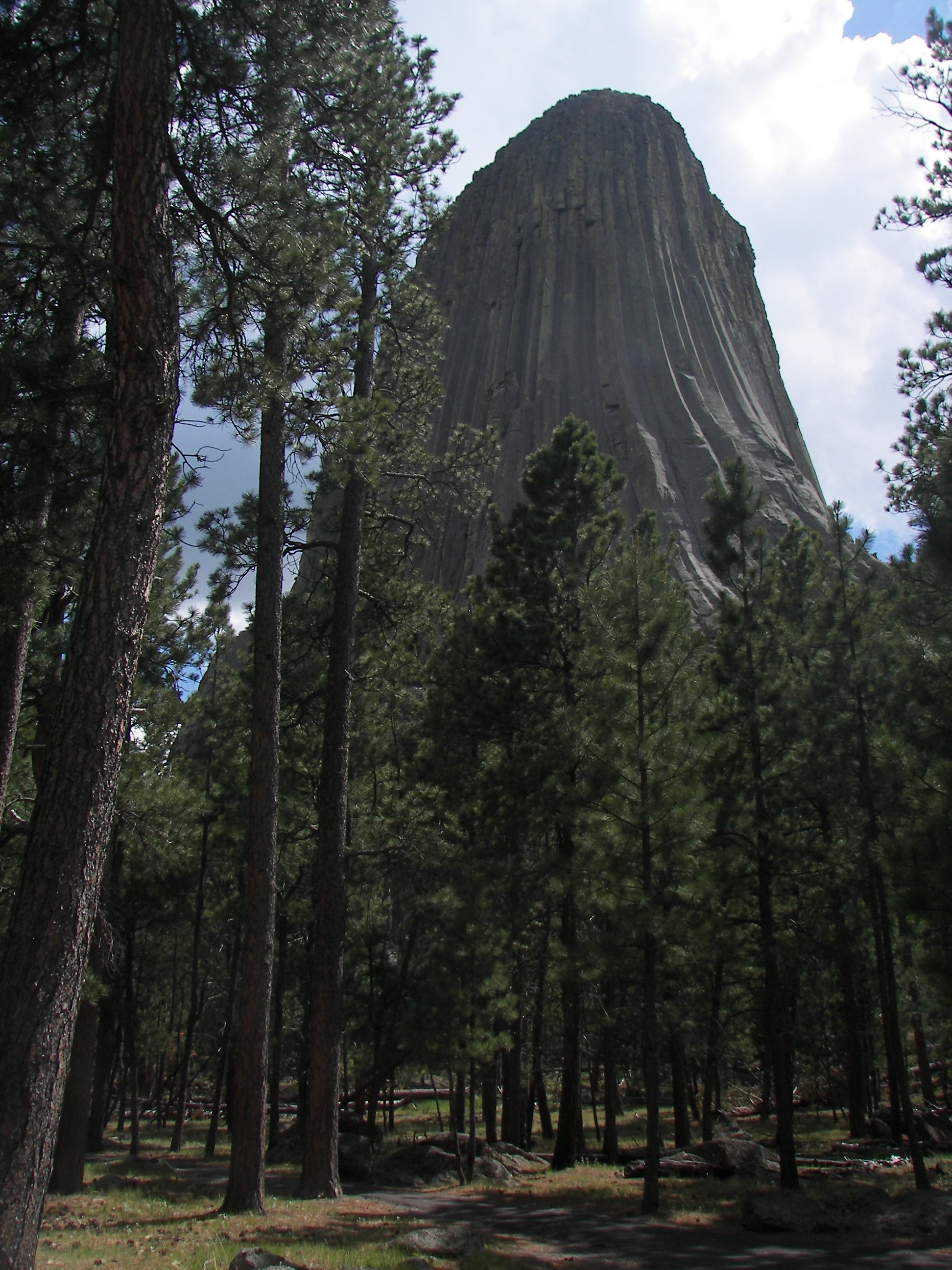 Devils Tower"About 50 million years ago molten magma was forced into sedimentary rocks above and cooled underground. As it cooled, it contracted and fractured into columns. An earlier flow formed Little Missouri Buttes. Over millions of years erosion of the sedimentary rock exposed Devils Tower and accentuated Little Missouri Buttes. The Tower rises 867 feet from its base and stands 1,267 feet above the [Belle Fourche] river and 5,112 feet above sea level. The area of its teardrop-shaped top is 1.5 acres. The diameter of its base is 1,000 feet."