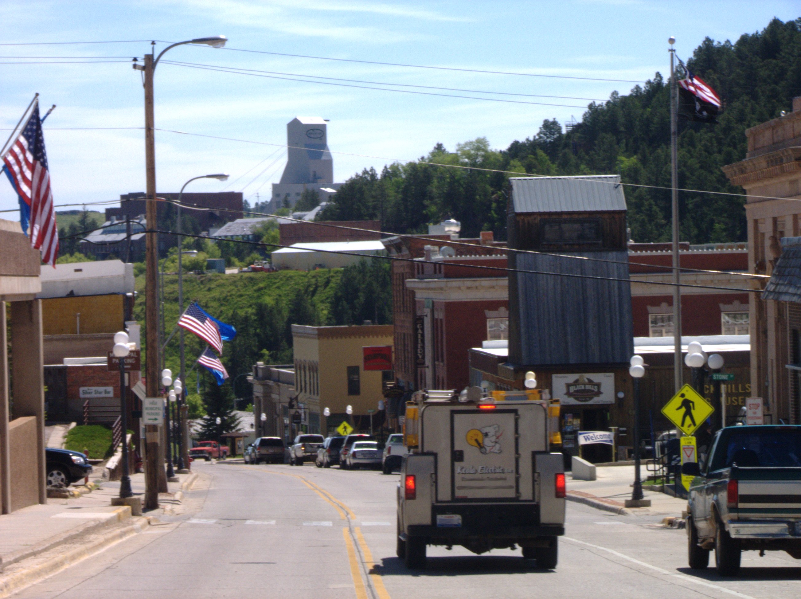 Main Street — Lead, SDYou are looking at why the Black Hills Region is where it is today economically. On the ridge is one of the headframes for the Homestake Gold Mine. Lead (pronounced LEED, a gold lode) is (or rather was) a gold mining town. Gold in the Hills was confirmed by the Custer expedition to the Sioux Reservation in 1874, which was mounted despite the Fort Laramie Treaty of 1868. The crippled Second Grant Administration could not or would not try to constrain American poaching against the Indian Nation, thus bringing about American defeat at the Battle of the Little Big Horn in 1876 and ultimately retaliatory expropriation of modern day western South Dakota by Congress in 1877.