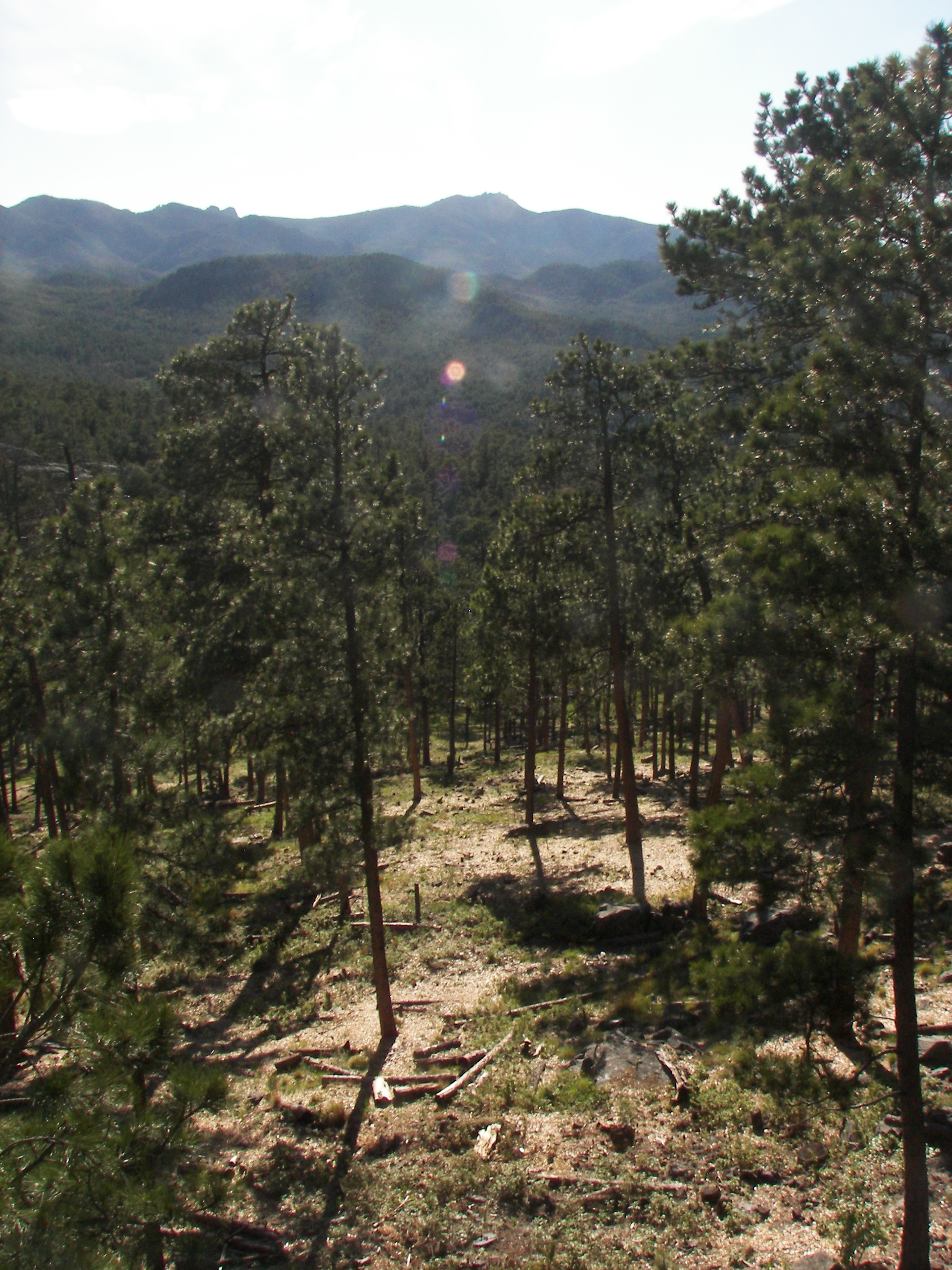 View from Iron MountainThe Iron Mountain Road starts at the eastern edge of Custer State Park and winds north by northwest through vistas atop open savannas in the rain shadow of the Black Hills to ascend the peak of Iron Mountain by a set of switchbacks. It descends by yet another. A trip up Iron Mountain Road can be tedious, and some drivers with destinations in mind mistakenly turn onto it. A lady in a minivan accosted a clutch of photographers standing in the middle of the road outside one of the tunnels and asked us whether the road went anywhere. "Please tell me it winds up somewhere — that there's an end to it? How much farther is it?" Obviously she was not with the program.
