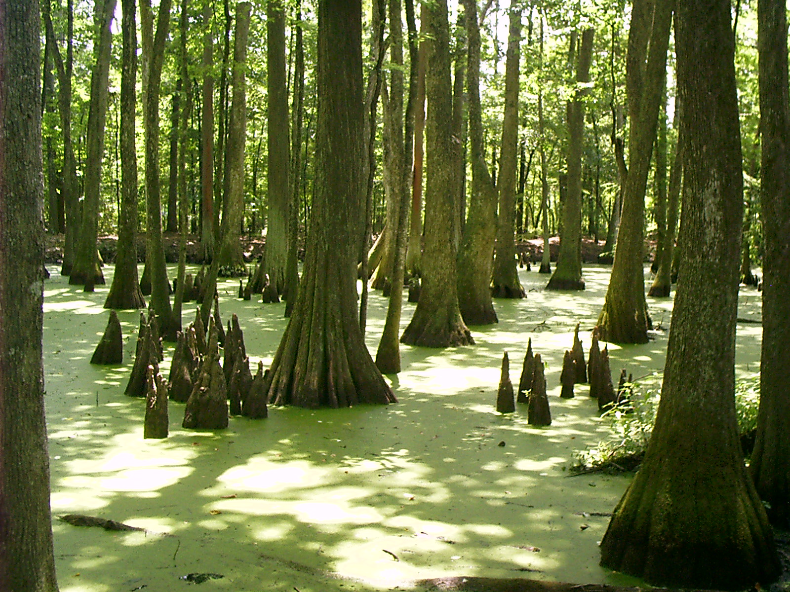 Knees, Cypress Swamp, Natchez Trace, Jackson, MSThe Natchez Trace is a 450-mi-long trail, connecting Natchez, MS, on the Mississippi River with Nashville, TN, on the Cumberland River. In its southern sections, it traverses low-lying terrain through hot and humid climate. Beware of el lagartos. |