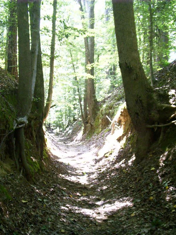 Sunken Trace, Natchez Trace, Saltillo, MSWherever the Trace topped a rise, there was mud because the ground was farther from drainage. Mud stuck to men's boots, horses' hooves, and wagon wheels and was carried off a long way. This caused the road bed gradually to subside below the level of the surrounding terrain. |