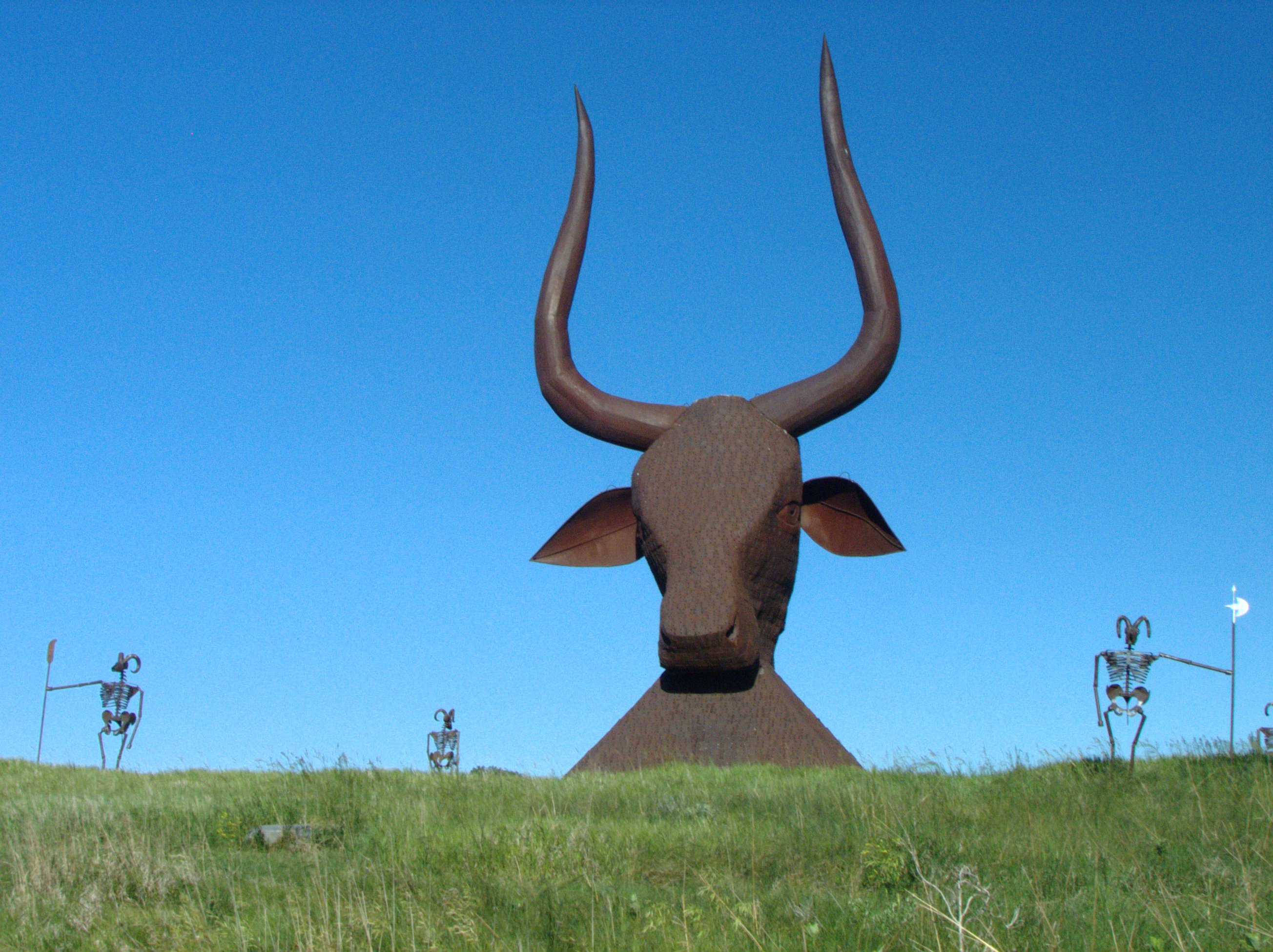 ApisThe bull, gazing benignly down upon westbound traffic, is made of several hundred railroad tie plates. It is not lit after dark. |