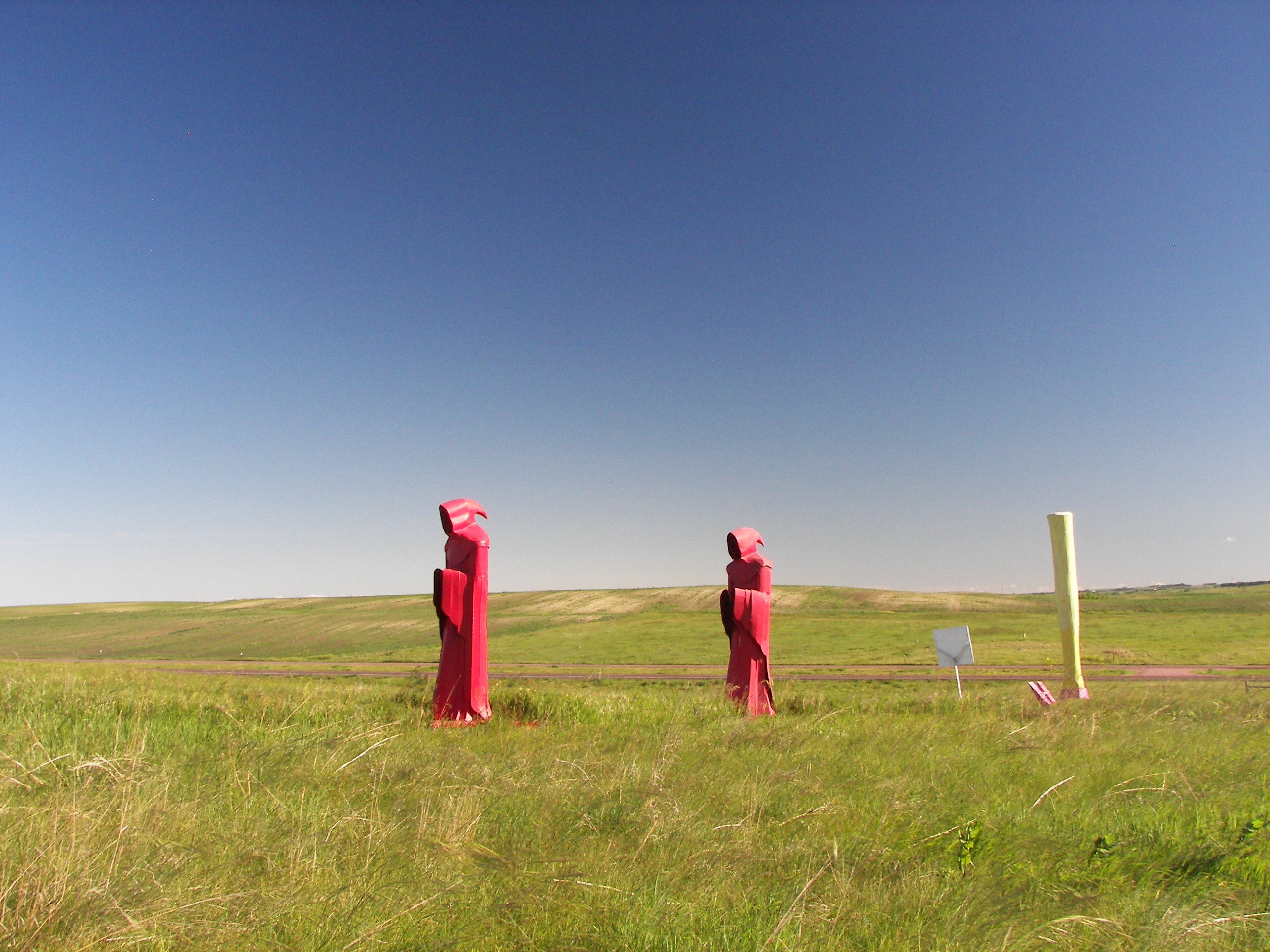 Mallei MaleficarumEvery good graven image requires acolytes, and, those being scarce in Republican-dominated South Dakota, Mr. Porter thoughtfully has provided simulacra. Sioux quartzite is quarried locally for aggregates used in concrete and asphalt and in these parts imparts a peculiar pink to road surfaces. Not for nothing is South Dakota numbered among the red states. |