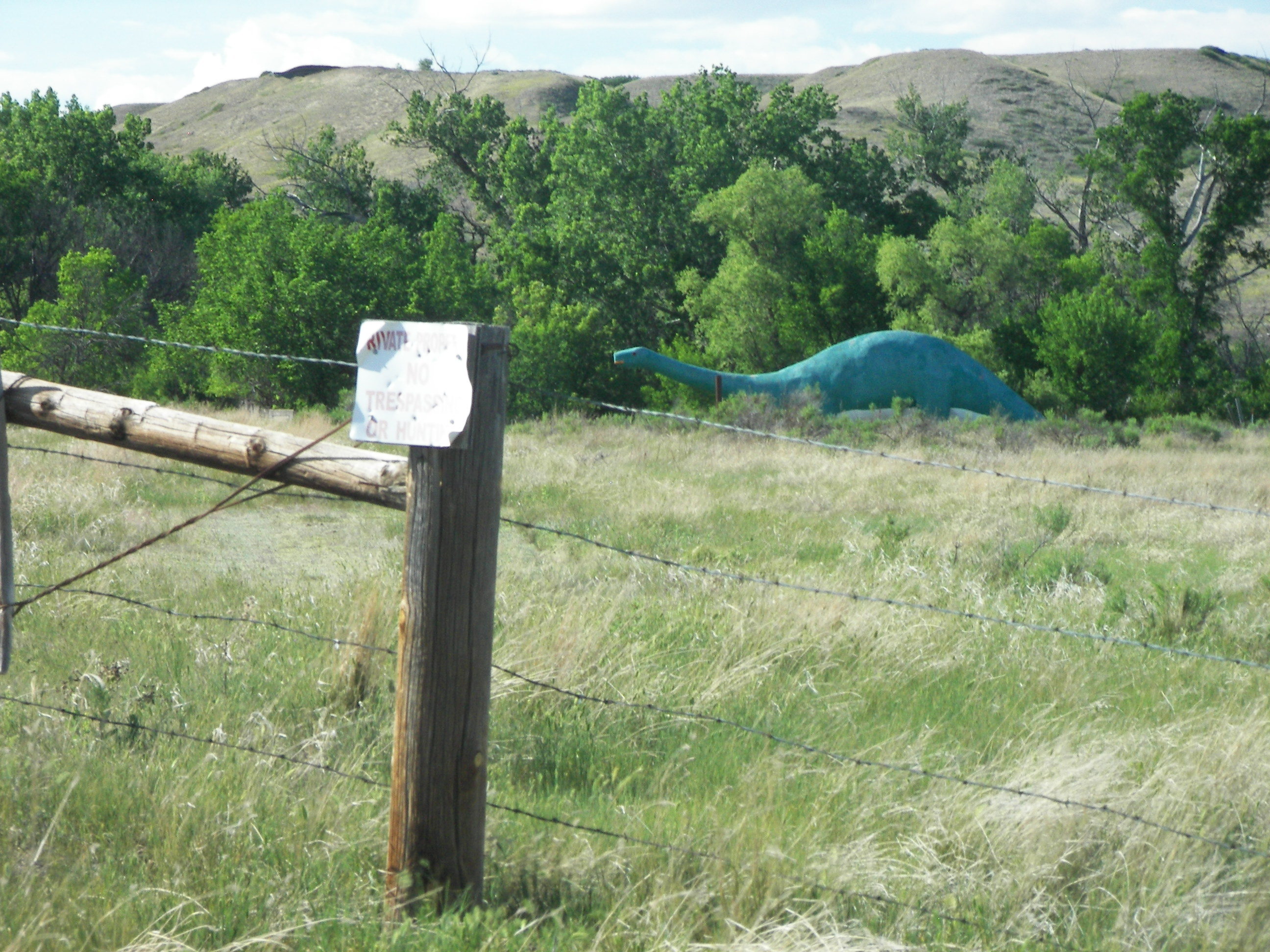 Creston DinosaurCreston, SD, is a railroad ghost town located along SD 44 on the banks of Rapid Creek in the Cheyenne River Valley between the bridge over the former and the bridge over the latter. Wall Drug erected their cement dinosaur when I-90 came through in the late 1960s. Rapid City dedicated their WPA-financed Dinosaur Park in 1936. According to various unauthoritative sources, Creston General Store had theirs up by 1933, making it the first, so apparently it was a good idea — just not the right idea to save the town.