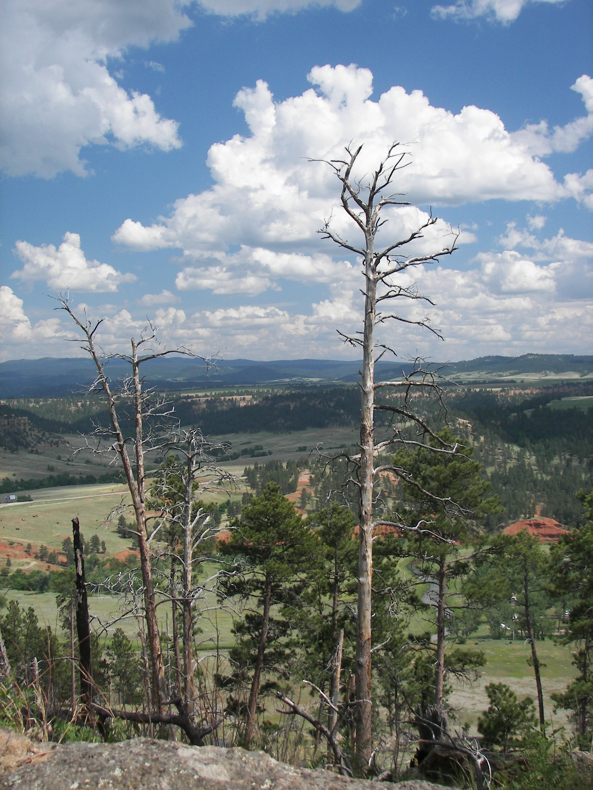 Catching the CloudsThe Hills appear black because pines grow on their slopes. The pines grow there and not on the dry plains 'round about because the Hills lift the prevailing winds, cooling them and wringing out excess moisture as rain and snow. You can see bits of fabric tied to bushes around Devils Tower. These are prayer cloths left by Indians and Wiccans. |