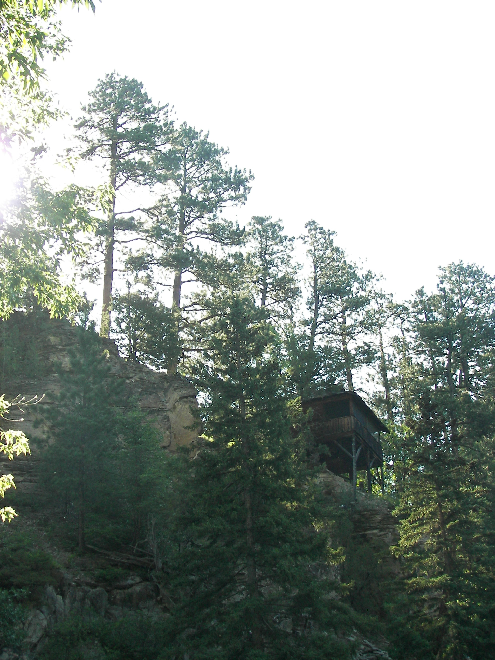 Rimrock Lodge CabinDuring our sojourn in the Black Hills we stayed at Rimrock Lodge in Spearfish Canyon. Three of our troup occupied this cabin perched on the canyon wall. When the rest visited, they made us stand by the door on the landward side.