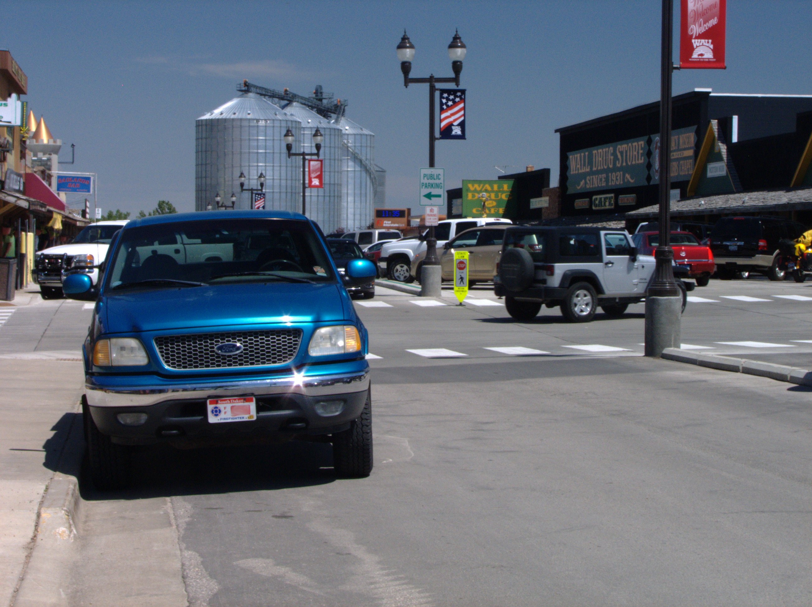 Al's OasisThen it's on to Al's Oasis, a truck stop on the Missouri River, which has matured into a tourist mecca, though in that regard it is the merest foreshadowing of the glories of Wall Drug. I didn't see any acolytes here. Oacoma, SD, is less than a degree east of 100° west, which divides the arable from the arid lands. In this place it is the river that signals the westward shift from flat terrain to high rolling hills, from row crops to hay. On this trip I missed recording a fuel stop partway through, so I don't have comprehensive mileage figures. Total distance was about 2300 miles. Over the first 1700 miles mileage by the tankful varied between 27 miles per gallon and 47 mpg. Variance is largely due to my practice of topping off each tank by varying amounts. Overall mileage was 35.9 mpg. However, I did encounter headwinds of 30 miles per hour for the better part of a couple of days. My 30-year-old bike kept ahead of traffic under 75 mph limits, sustaining relative air speeds in excess of 100 mph. Fuel prices varied from $3.579 at Luvern, MN, to $4.059 in the Dells of Wisconsin. Much of the price difference is due to my purchase of gasoline in preference to gasohol where available. |