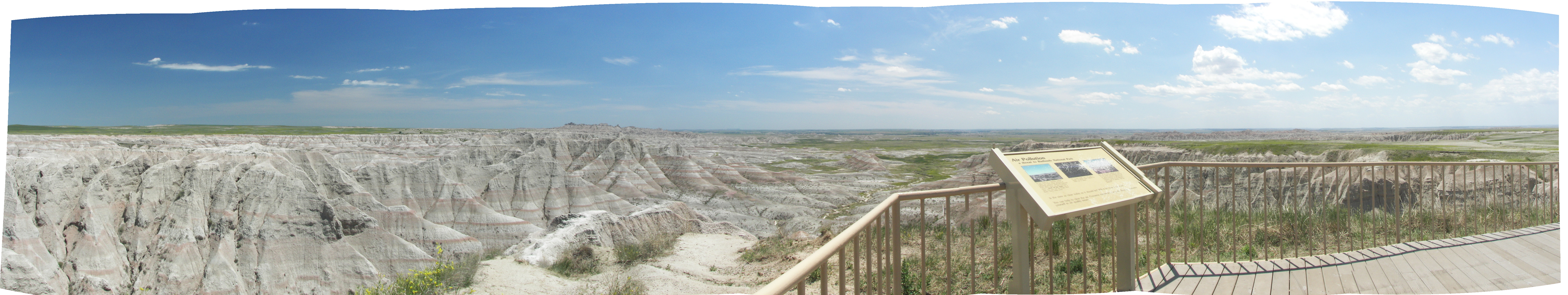 Badlands of the White RiverThe Badlands are a heavily eroded, broken boundary between grassy mesas and grassy bottom lands. One sees the free pasture at hand in a wet year and imagines the size of the cattle herd he could run there, but such dreams founder on how hard (and unprofitable) it might be to find the individual cows and their calves, round them up, and remove them all to market in a dry year. This picture is a panoramic stitch of eight frames performed by the Linux Hugin utility by Pablo d'Angelo. |