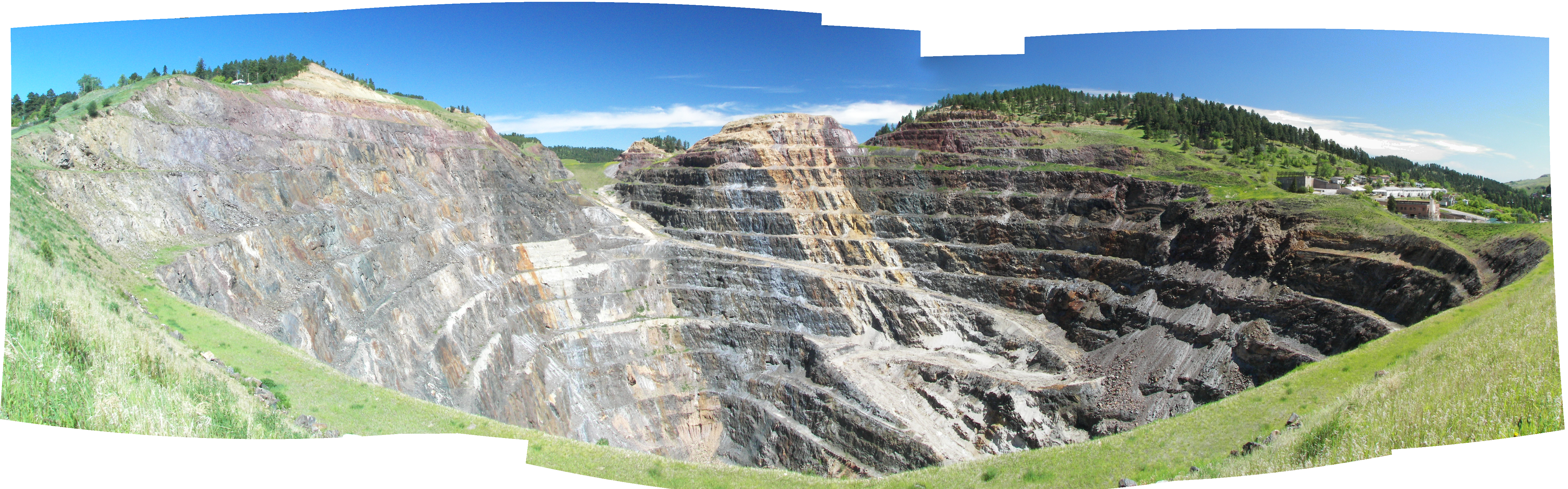 Open Cut — Homestake MineThe Homestake operated from its discovery in 1876 until 2002. It yielded (to great expense) 39.8 million ounces, which at spot prices for gold of about $1500 as of this writing would be worth altogether very nearly $60 billion. This was a deep rock mine reaching eight thousand feet beneath the town of Lead. The Open Cut is a visible surface operation at Homestake one-half mile wide and 1200 feet deep that was worked off and on over the life of the mine. Follow the map link in the caption to the left to see how the Open Cut shaped the town of Lead, its streets, and surrounding highways.