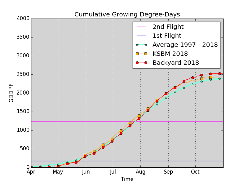 In commercial orchards, achieving significant control of the first flight means the second flight may be so insignificant that no further controls are required. This is not true in the backyard orchard where the second flight originates from uncontrolled sources so close that they might as well be on the premises. Pheromone traps must be maintained even after the first biofix. Chemical control in some parts of the world has tended to favor delaying pupation so that mating of first flight adults is at least a long, drawn-out affair. There may even be a noticeable second peak of the first flight showing up in pheromone traps (OMAFRA, Walgenbach, Knight). If this is the case, then chemicals may need to be reapplied for complete control of the first flight. Pheromone traps must be maintained to detect the onset of the second flight, too. This is the second biofix. The second flight may be expected to peak at 1175 Growing Degree-Days, which is about 1000 Growing Degree-Days from the first biofix (Brunner). The second flight follows the same pattern of development as the first, and chemical controls follow the same stages according to Growing Degree-Days. Of course, development is accelerated in the summer weather, and growth stages follow one another at a faster pace according to the calendar, so, even though development of the second flight is never as closely synchronized as the first flight, it still occurs over a relatively narrow time frame. 8.4 Tracking Growing Degree-DaysIt is possible to determine the current cumulative growing Degree-Days at any location from the following Web page maintained by Oregon State University: Select your location from the Google Map widget and click on the CALC/RUN buttons. The Oregon site produces a graph similar to the following one from 2018: Cumulative GDD — 2018 Sheboygan County Memorial Airport